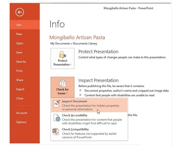 - وقتی که شما یک فایل پاورپوینت را ایجاد و به اشتراک می گذارید اطلاعات شخصی خاصی ممکن است به طور اتوماتیک به فایل اضافه شود. شما می توانید از