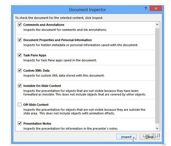 Document Inspector ظاهر می شود. بسته به محتوایی که می خواهید داشته باشید گزینه ها را انتخاب و یا از حالت انتخاب خارج کنید. روی