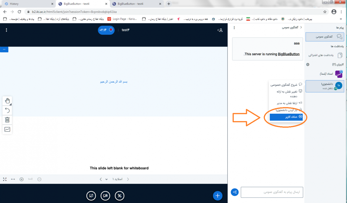 اگر شما استاد بزرگوار بنا به دلایلی قصد حذف دانشپژوهی را از کلاس آنلاین داشتید، لازم است بر روی اسم دانشپژوه مد نظر کلیک کرده تا پنجره ای باز شود: