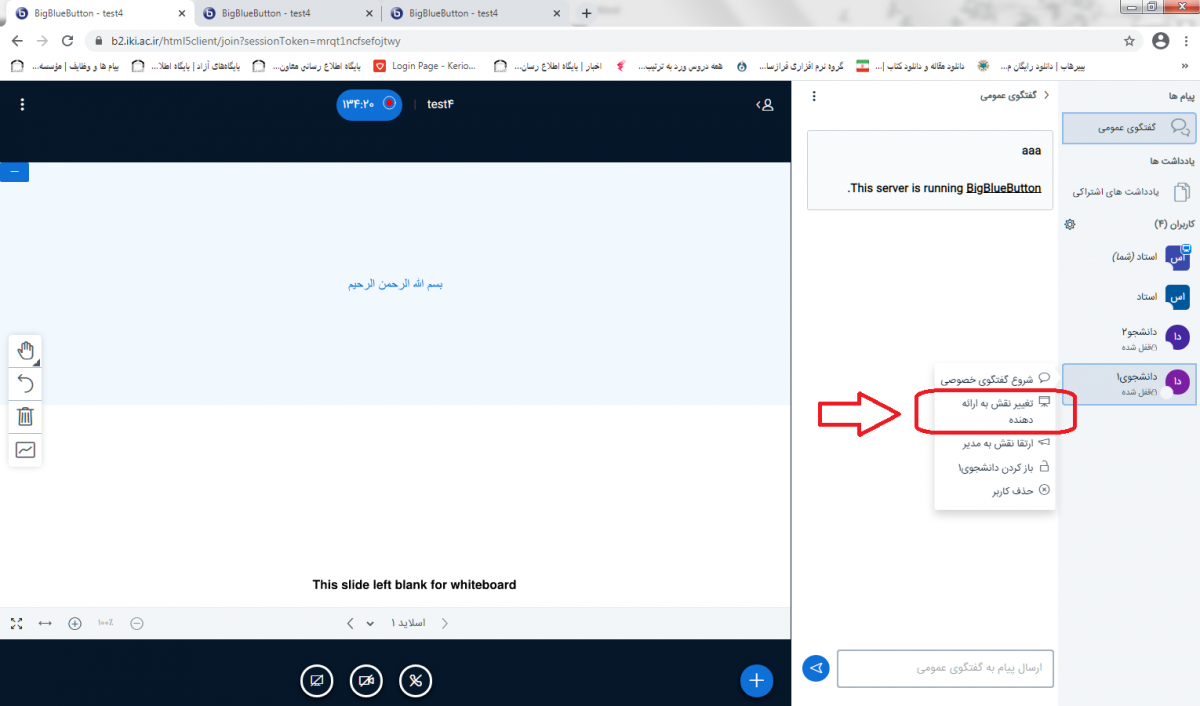 ج) بعداز باز شدن پنجره گزینه "تغییر نقش به ارائه دهنده" را انتخاب می نمائید تا دانش پژوه بتواند مطلب خود را ارائه دهد