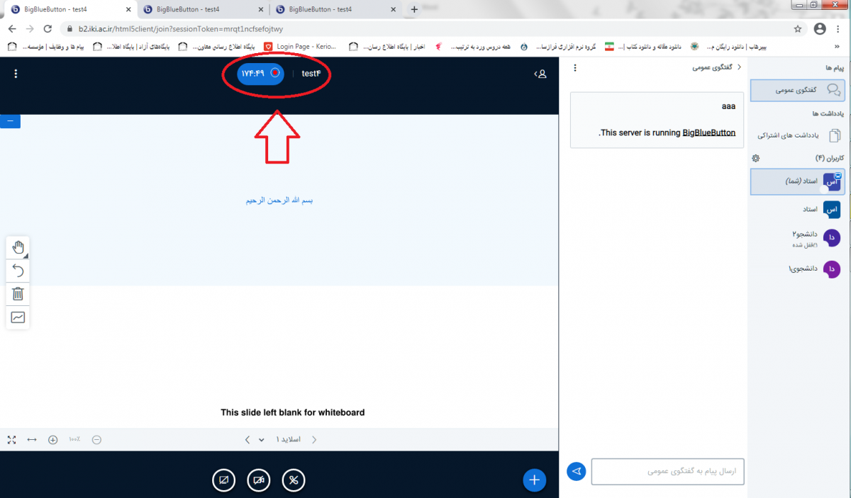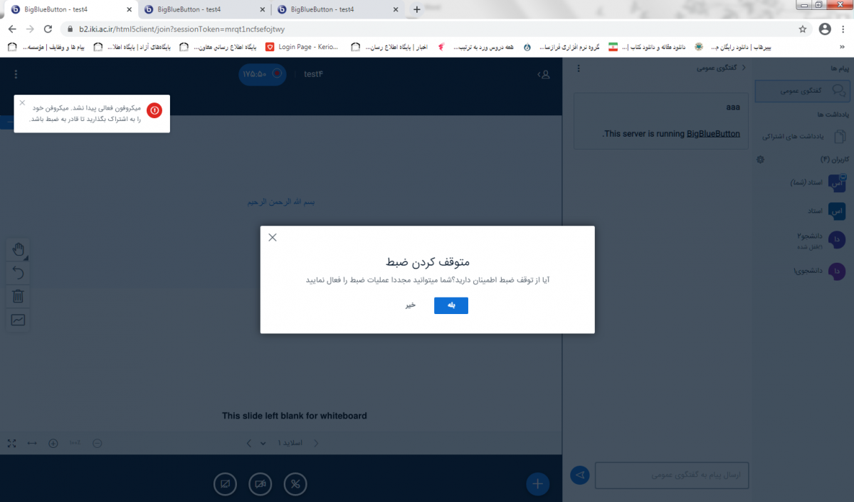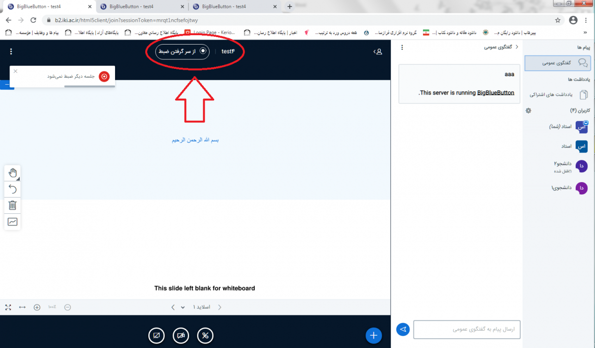 اگر استاد به هر دلیل تصمیم گرفت ضبط صوت کلاس را متوقف نماید، لازم است اول بر روی علامت قرمز رنگ ضبط کلیک نماید: