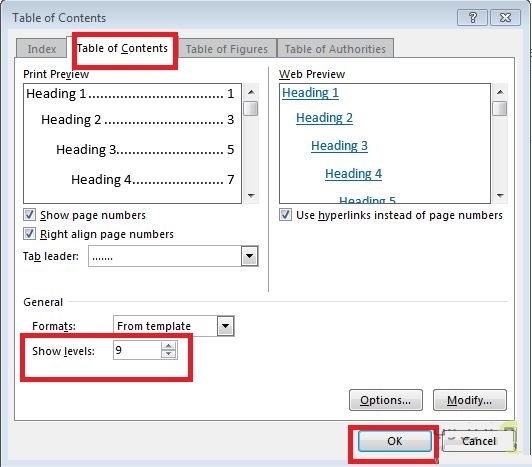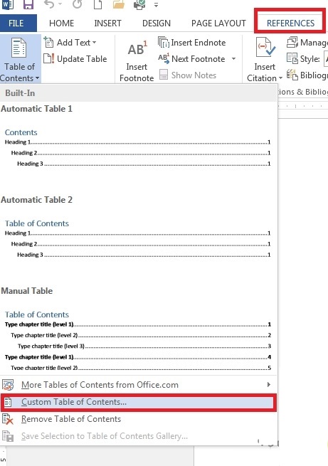 Custom Table of Contents را انتخاب کنید. این بار در پنجره ظاهر شده در قسمت