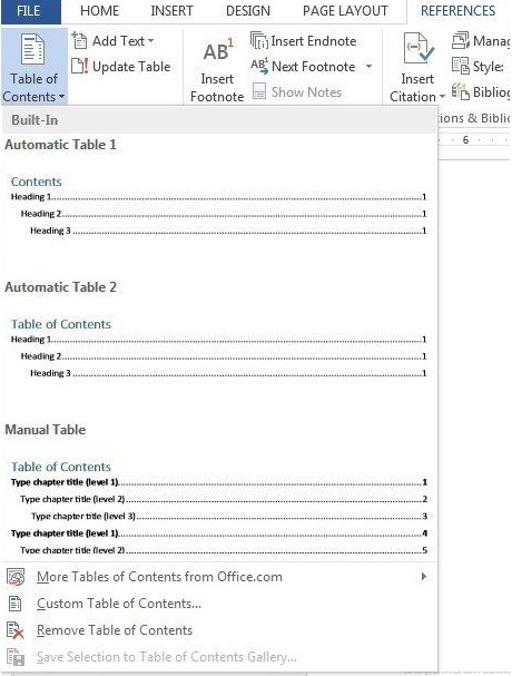 Table of Contents کلیک کنید. از فهرست نمایش داده شده یکی از فرم های فهرست را انتخاب کنید