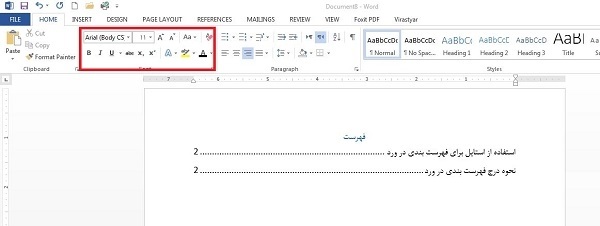Table of Contents را پاک می کنیم و به جای آن فهرست می نویسیم. متن را انتخاب می کنیم و با استفاده از ابزارهای قسمت