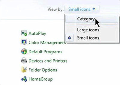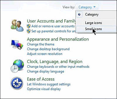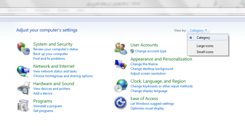 به صورت پيشفرض طبقهبندي براساس گروهها يعني به صورت Category تنظيم شده است با كليك روي فلش كوچكي كه كنار آن وجود دارد ميتوانيد شيوه نمايش آيكنها را به دلخواه تغيير دهيد. با انتخاب Small icons ليستي از تمام آيكنهاي موجود در Control panel را مشاهده ميكنيد