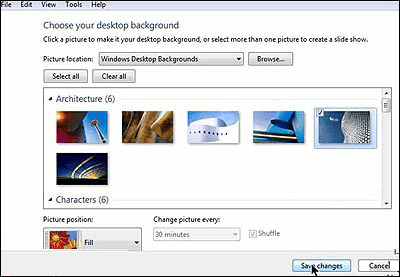 با كليك در نوار آدرس مسير اين پنجره را در نوار آدرس مشاهده ميكنيد اگر ميخواهيد از اين مسير وارد اين بخش شويد مدت زيادي طول ميكشد در صورتي كه به روش گفته شده با يك كليك وارد همين پنجره شدهايد در اين پنجره ميتوانيد يكي از تصاوير را به عنوان پسزمينه انتخاب كرده و Save change را كليك كنيد تا تغييرات اعمال شود.