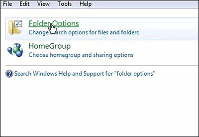 در اينجا با كليك روي Cancel به صفحه قبل برميگرديد. اكنون فرض كنيد كه ميخواهيد به قسمت Folder options برويد در صفحه اصلي Control panel گزينه مربوط به Folder options را مشاهده نميكنيد براي پيدا كردن اين مورد در قسمت Search بالاي صفحه كلمه Folder options را تايپ كنيد اكنون در پايين صفحه نتايج جستجو نمايش داده خواهند شد در ابتداي ليست نمايش گزينه Folder options را مشاهده خواهيد كرد با كليك روي اين گزينه پنجره Folder options گشوده خواهد شد