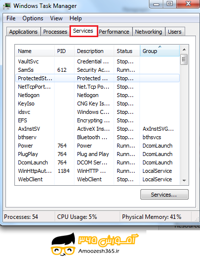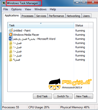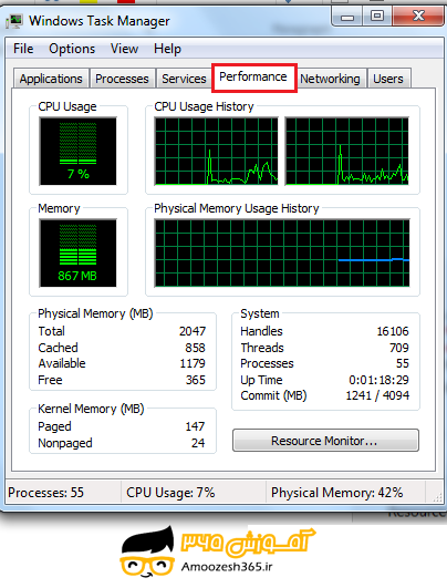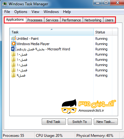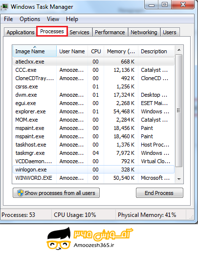 در پنجره این برنامه میتوانیم میزان استفاده از منابع سیستم را کاملا زیر نظر داشته باشیم و در صورت مشاهده نمونه ای که زیاد از منابع سیستم استفاده می کند آن را متوقف می کنیم.