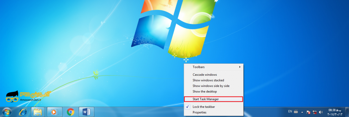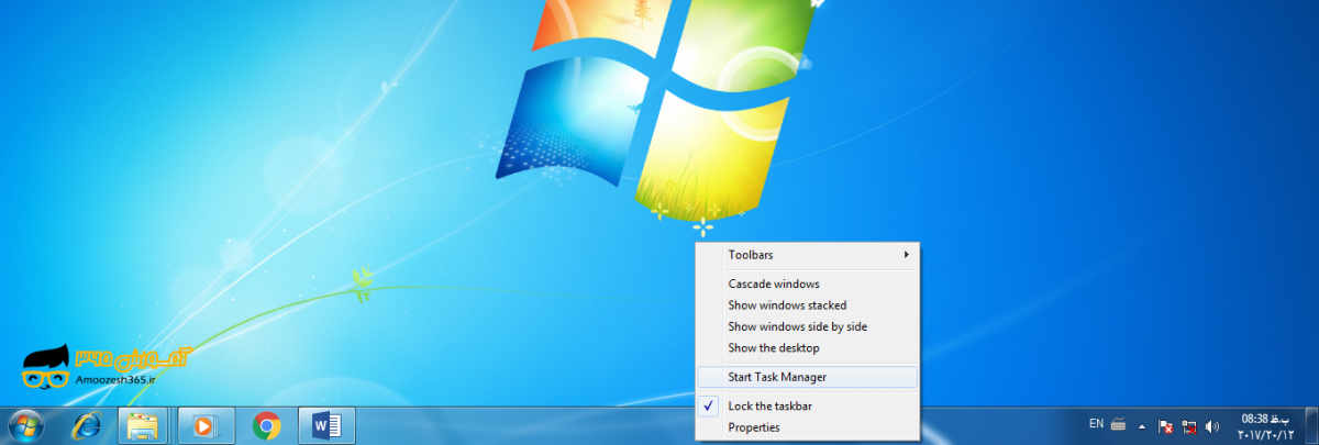 می توانیم درناحیه نوار وظیفه (Task bar) پایین صفحه دسکتاپ کلیک راست کنیم