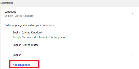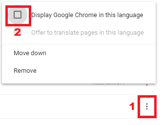 ۸- زبان یا زبان های انتخاب شده شما در منوی مربوط به زبان ها ظاهر می شوند. برای انتخاب کردن یکی از آنها ابتدا در زیر همان کادر Language روی آیکون سه نقطه روبروی زبانی که می خواهید مرورگر به آن زبان تغییر کند، کلیک کرده و سپس تیک گزینه Display Google Chrome in this language را فعال کنید.