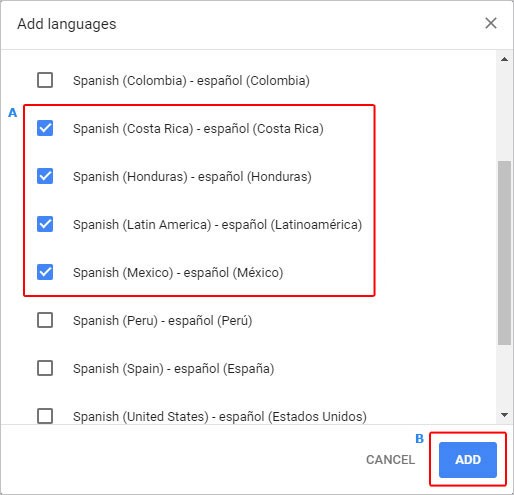 ۷- لیستی از زبان های مختلف ظاهر می شود. برای تغییر زبان در گوگل کروم ، زبان مورد نظر خود را با تیک دار کردن انتخاب کرده و سپس روی Add کلیک کنید. همچنین در این مرحله می توانید بیش از یک زبان را با تیک دار کردن انتخاب نمایید.