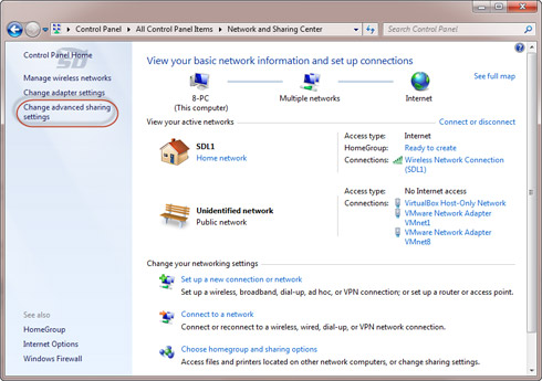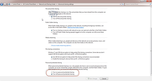 برای باز کردن دسترسی کامپیوتر ها در صفحه Network And Sharing Center از منو سمت چپ Change Advanced Sharing Settings  را انتخاب کرده، وارد قسمت های Home و Public شده و همه گزینه ها به جز گزینه آخر که مربوط به پسورد میباشد باید روشن باشد، و فقط این گزینه را بر روی خاموش قرار دهید.