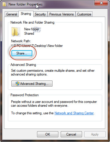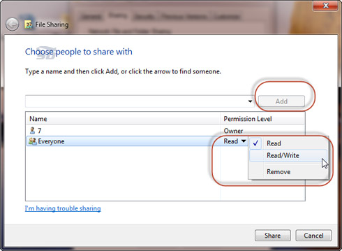 برای این کار یک پوشه ایجاد میکنید و بر روی آن راست کلیک کرده و گزینه Properties را انتخاب و وارد تب Sharing شوید، دکمه Share را بزنید و نام کاربری که میخواهید دسترسی داشته باشد را Add کنید، و دسترسی Read / Write را انتخاب کنید و دکمه OK را بزنید، اکنون پوشه شما در شبکه قابل رویت است.