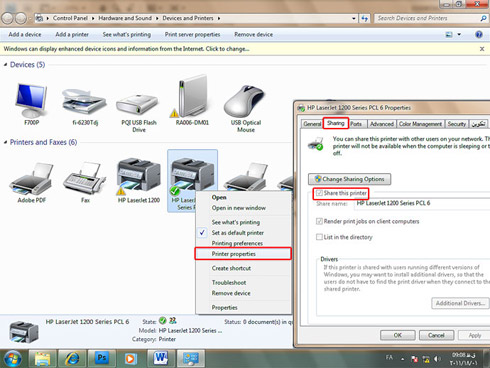 برای اشتراک گذاری پرینتر در قسمت Control Panel وارد Devices And Printer  و بر روی آیکون پرینتر خود راست کلیک کرده Properties را انتخاب کرده و از تب بالا وارد Sharing شده و بر روی Share This Printer کلیک کرده و دکمه ok را بزنید.