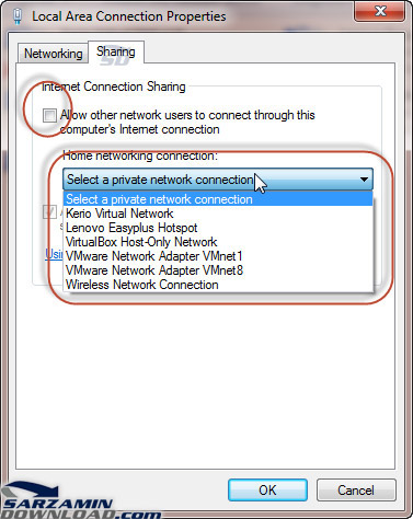 برای اینکه اینترنتی که به سیتسم اول متصل است را بتوانید در دیگر سیستم ها استفاده کنید به صفحه Change Adapter Settings رفته و بر روی کارت شبکه LAN راست کلیک کرده، وارد Properties شده و از تب Sharing گزینه Allow Other Network Users را انتخاب و از لیست زیر کارت شبکه ای که اینترنت را از آن دریافت میکنید را انتخاب و دکمه OK  را میزنید، حال میتوایند در کامپیوتر های دیگر از اینترنت استفاده کنید.