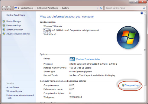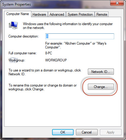 برای این منظور بر روی آیکون Computer راست کلیک کرده و Properties را انتخاب میکنید، در قسمت Computer name وارد گزینه Change Setting شده و بر روی دکمه Change کلیک میکنید.