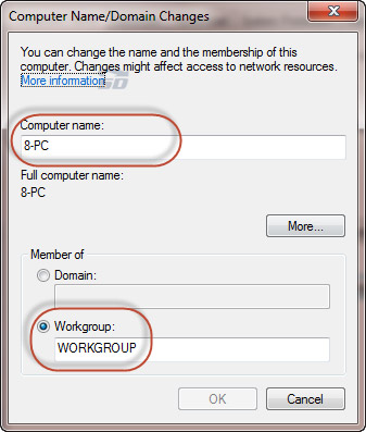 در این قسمت نام کامپیوتر را میتوانید انتخاب کنید. گزینه WORKGROUP فعال باید باشد.