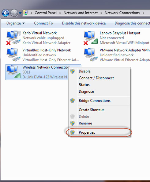 از قسمت Control Panel  وارد قسمت Networking And Sharing Center شوید، از منوی سمت چپ گزینه Change Adapter Setting را زده و بر روی Wireless Network Connection راست کلیک کرده و properties را انتخاب کنید.