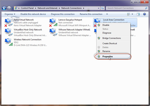 از قسمت Control Panel  وارد قسمت Networking And Sharing Center شوید، از منوی سمت چپ گزینه Change Adapter Setting را زده و بر روی Local Area Connetction راست کلیک کرده و properties را انخاب کنید.