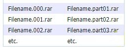 فایل های فشرده ای که به چند پارت تقسیم شده اند از نظم خاصی در نام گذاری برخوردارند. برای مثال می توانید به جدول زیر که دو شیوه نام گذاری این فایل ها را نمایش می دهد توجه کنید.
