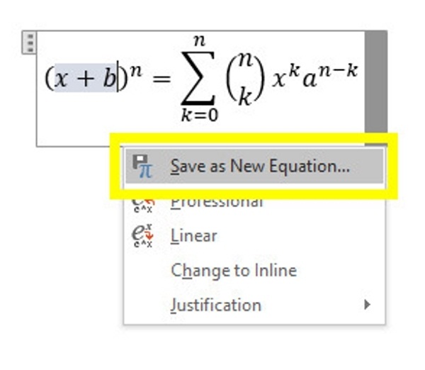 شما می توانید تغیرات مورد نظر را در فرمول اعمال کنید. در صورتی که فرمول جدید ساخته شده برای شما پرکاربرد است، روی فلش کنار باکس فرمول کلیک کنید و گزینه Save as New Equation را انتخاب کنید.