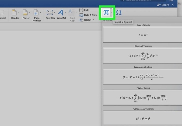 برای استفاده از فرمول های آماده در ورد که پر کاربرد هستند، به منوی Insert رفته و روی منوی کشویی Equation کلیک کنید.