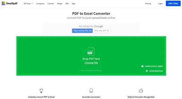 سرویس آنلاین SmallPDF قابلیت تبدیل فرمت های مختلف به PDF و برعکس را فراهم ساخته است. استفاده از این ابزار جهت تبدیل فایل PDF به فایل Excel ساده است. به راحتی فایل خود را روی قسمت سبز رنگ سایت بکشید و یا با کلیک روی آیکن پوشه، فایل را از سیستم خود انتخاب کنید.