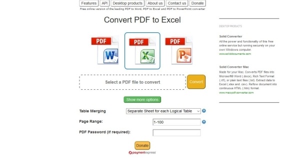 شما همچنین می توانید از سایت Simply PDF هم جهت تبدیل پی دی اف به اکسل آنلاین استفاده کنید. پس از انتخاب و آپلود فایل های خود، با کلیک روی دکمه Show More Options می توانید تنظیمات بیشتری را ببینید. پس از انتخاب تنظیمات مورد نظر، با کلیک روی Convert، فایل های شما تبدیل فرمت می شوند.