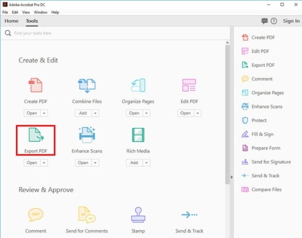 اگر شما همیشه با پی دی اف سر و کار دارید، احتمالا برنامه Adobe Acrobat DC را هم در کامپیوتر خود دارید. با استفاده از این نرم افزار تبدیل فرمت PDF به Excel هم می توان اقدام به انجام این تبدیل کرد که برای فایل های حجیم تر یا تعداد زیاد، مناسب تر می باشد. پس از باز کردن این برنامه به تب Tools بروید. سپس روی دکمه Export PDF کلیک کنید.