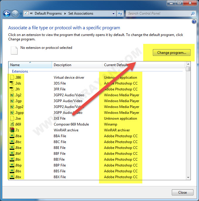 3- همانطور که در تصویر زیر مشاهده می کنید فرمت هر برنامه در سمت چپ و برنامه ای که باید آن فرمت را باز کند در سمت راست قرار دارد . حال اگر بخواهید فرمت یکی از فایل ها را تغییر بدهید می توانید با کلیک بر روی کلید Change Program برنامه جایگزین را مشخص و انتخاب کنید .