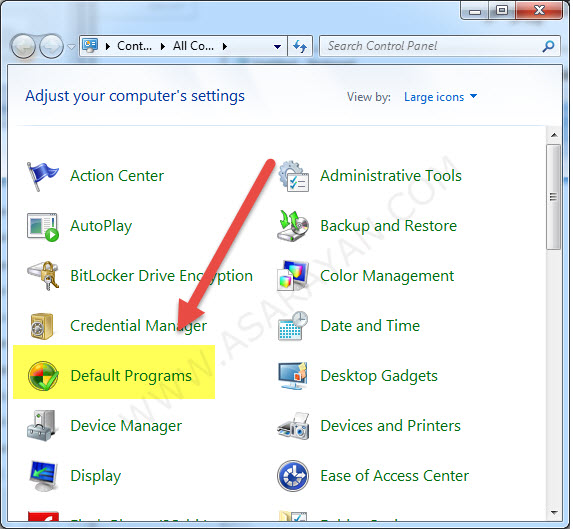 1- بر روی منوی استارت کلیک کرده و گزینه Control Panel را انتخاب کنید . از میان آیکن های تنظیمات کنترل پنل گزینه Default Programs را انتخاب و بر روی آن یکبار کلیک کنید .