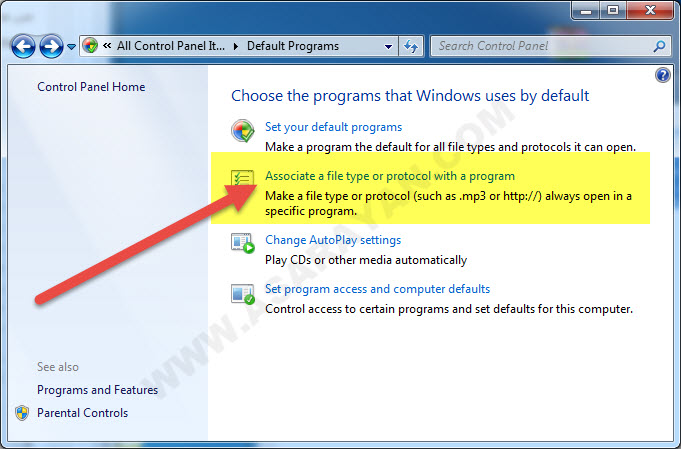 2- همانطور که مشاهده می کنید این پنجره مربوط به تنظیمات فرمت فایل هایی می باشد که باید هر کدام توسط برنامه خاصی باز شوند . بر روی گزینه Associate a file type or protocol with a program کلیک کنید .