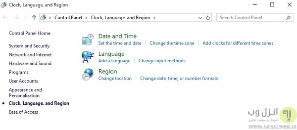 جهت فارسی سازی تقویم و ساعت در ویندوز ۱۰ مسیر زیر را دنیال کنید: