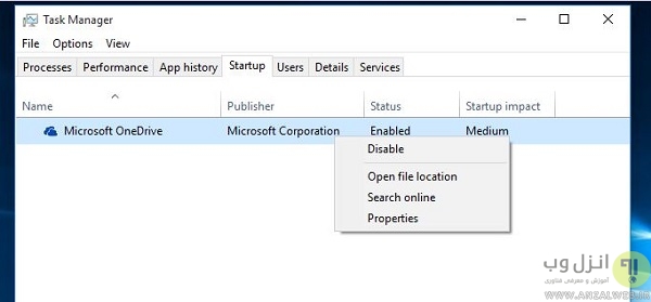 ابتدا لیست را به دقیت بررسی کنید و برنامه هایی  مثل Microsoft One Drive که شاید به درد شما نخورند و باعث کندی سیستم شوند را از لیست انتخاب و بر روی آنها کلیک راست کنید و گزینه Disable را برای غیر فعال سازی اجرای خودکار آنها در شروع ویندوز ۱۰ انتخاب کنید.
