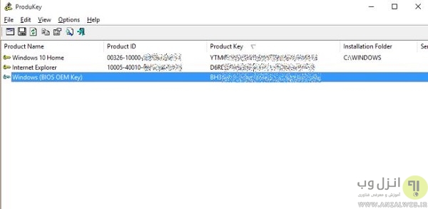 با نصب و اجرای برنامه بر اساس ورژن ویندوزی که نصب کرده اید Product Key و Product ID ویندوز ۱۰ در لیست نشان داده میشود.
