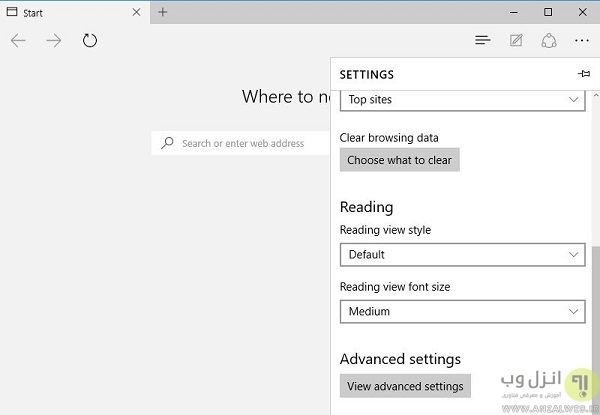 در مرورگر بر روی آیکن سه نقطه کلیک و گزینه Setting را انتخاب کنید،سپس از پایین لیست بر روی دکمه view advance setting کلیک کنید.
