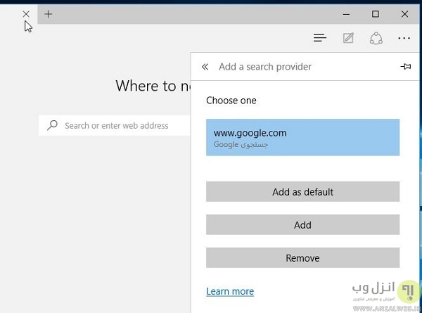 بر روی لیست بخش Search in the address bar with که bing پیشفرض آن است کلیک و گزینه Add را انتخاب نمایید.