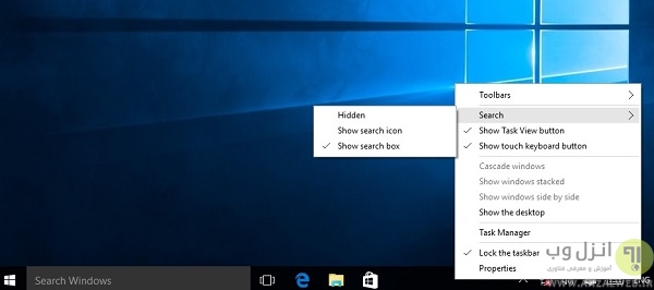 بر روی فضای خالی تسکبار کلیک راست کنید و از بخش Search گزینه Show search box را به       Hidden (در صورت انتخاب این گزینه به طور کل کورتنا در تسکبار نمایش داده نمیشود)  یا Show Search icon (در صورت انتخاب این گزینه فقط آیکن جستجو کورتنا در تسکبار نمایش داده میشود) تغییر دهید.