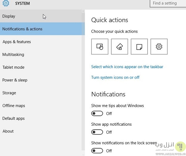 تب Notifications & actions را انتخاب و در قسمت پایین بخش Notifications گزینه Show me tips about windows را off کنید.