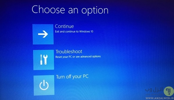ابتدا سیستم خود را ریستارت (restart) کنید و هنگامی که به صفحه لوگین اسکرین وارد شدید (login screen) بر روی دکمه پاور کلیک کنید و پس از باز شدن لیست دکمه شیفت (Shift) کیبورد را نگه دارید و بر روی ریستارت کلیک کنید. (تا زمان ریستارت شدن سیستم دکمه شیفت را نگه دارید)