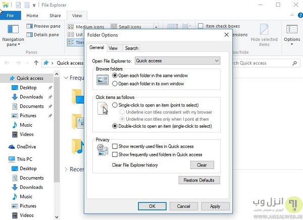 سپس در تب General و در بخش Privacy تیک گزینه های Show recently used files in Quick access و Show frequently used folders in Quick access را بردارید و بر روی Apply کلیک کنید و پنجره را ببندید.