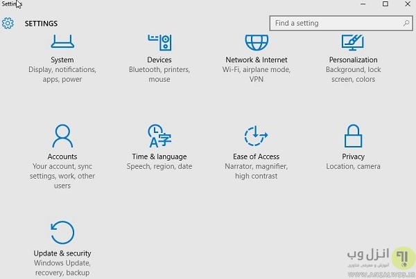 از Start Menu بر روی گزینه Setting کلیک کنید ، و در پنجره باز شده گزینه System را انتخاب کنید.