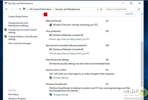 در قسمت بعد بر روی Security & Maintenance کلیک و زیر منو Security را باز کنید.به پایین صفحه رفته و از بخش Windows Smart Screen بر روی Change settings کلیک کنید.