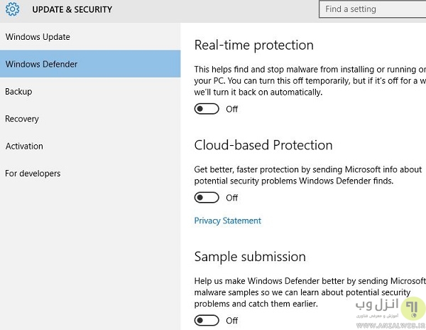 بر روی تب Windows Defender کلیک و گزینه های Real-time protection و Cloud-based protection  و Sample submission را off کنید.