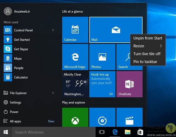 برای سفارشی کردن استارت منو (Windows 10 Start Menu Customize) نیاز به کار چندان پیچیده ای نیست،میتوانید هر طرف استارت از بالا به پایین یا از سمت را به چپ بکشید تا اندازه آن تغییر کنید و با کلیک راست بر روی کاشی های استارت منو از طریق گزینه های Resize یا Unpin اندازه کاشی های زنده مترو را تغییر یا آنها را از استارت منو حذف کنید.