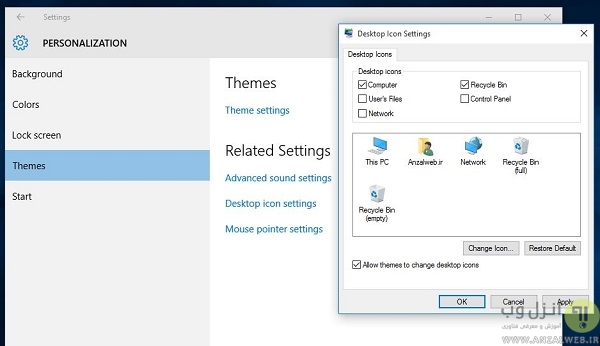 بر روی دسکتاپ کلیک راست و گزینه Personalize را انتخاب کنید.تب Themes انتخاب و گزینه Go to desktop icon settings را انتخاب کنید