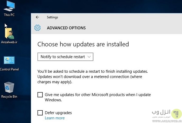 ابتدا لیست Choose how updates are installed را بر روی Notify to schedule restart تنظیم کنید که قبل از شروع دریافت و نصب به شما اخطاری داده شود و به صورت اتوماتیک ویندوز آپدیت نشود.