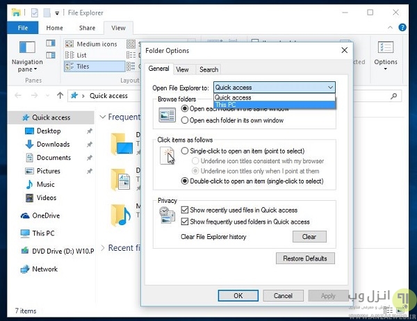 به طور پیشفرض پس از باز کردن اکسپلورر فایل ویندوز ۱۰ محیط مجازی Quick Access نمایش داده میشود و این برای کاربران قدیمی شاید کمی ناآشنا باشد،برای تغییر مسیر پیشفرض File Explorer ویندوز به This Computer یا همان My Computer قدیمی که شامل داریو های ویندوز (Drive) و .. می شود مسیر زیر را دنبال کنید:
