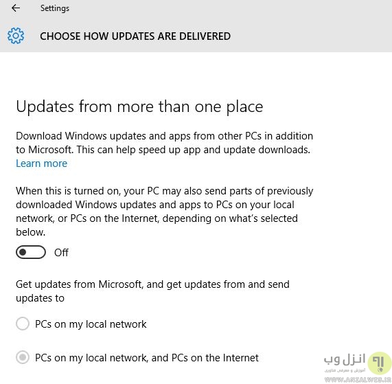 در این صفحه اگر بر روی زبانه آبی رنگ که روبروی آن on نوشته است کلیک کنید و آنرا به off تغییر دهید به طور کل فرآیند آپدیت اتوماتیک غیر فعال (Disable) خواهد شد. و دو گزینه PCs on my local network  و PCs on my local network, and PCs on the Internet به ترتیب برای فعال کردن آپدیت برای کامپیوترهای شخصی و مجازی شما میباشد.