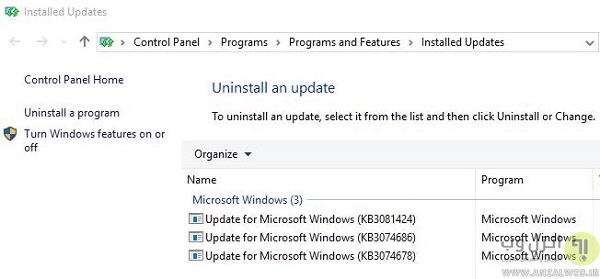 بالاترین گزینه در لیست جدیدترین آپدیت نصب شده و پایین ترین آن آپدیت های قدیمی است که با انتخاب و کلیک بر روی گزینه uninstall بالا آپدیت شروع به حذف شدن میکند.